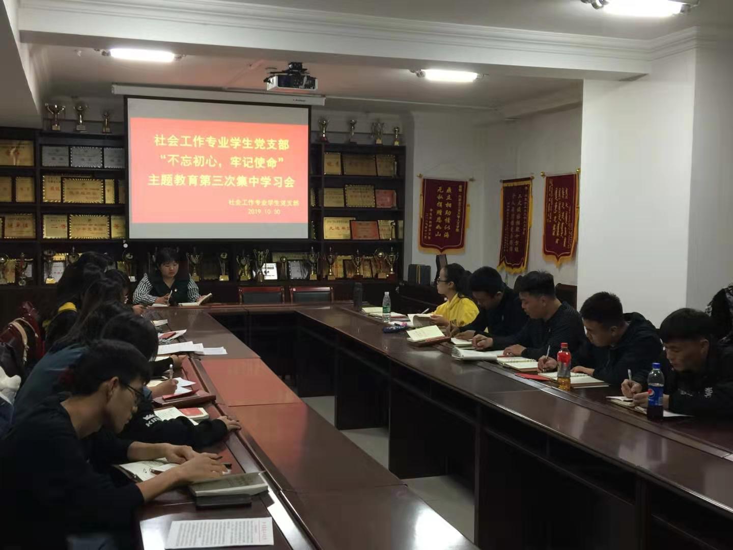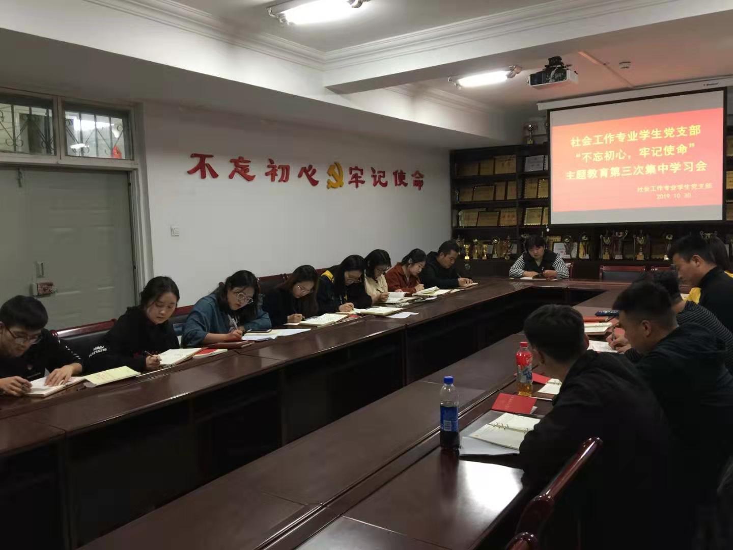 为深入推进“不忘初心、牢记使命”主题教育工作,1030日,社会工作专业党支部在电力大楼0320开展了第三次集中学习会,支部副书记查娜主持会议,全体党员、预备党员参加会议。