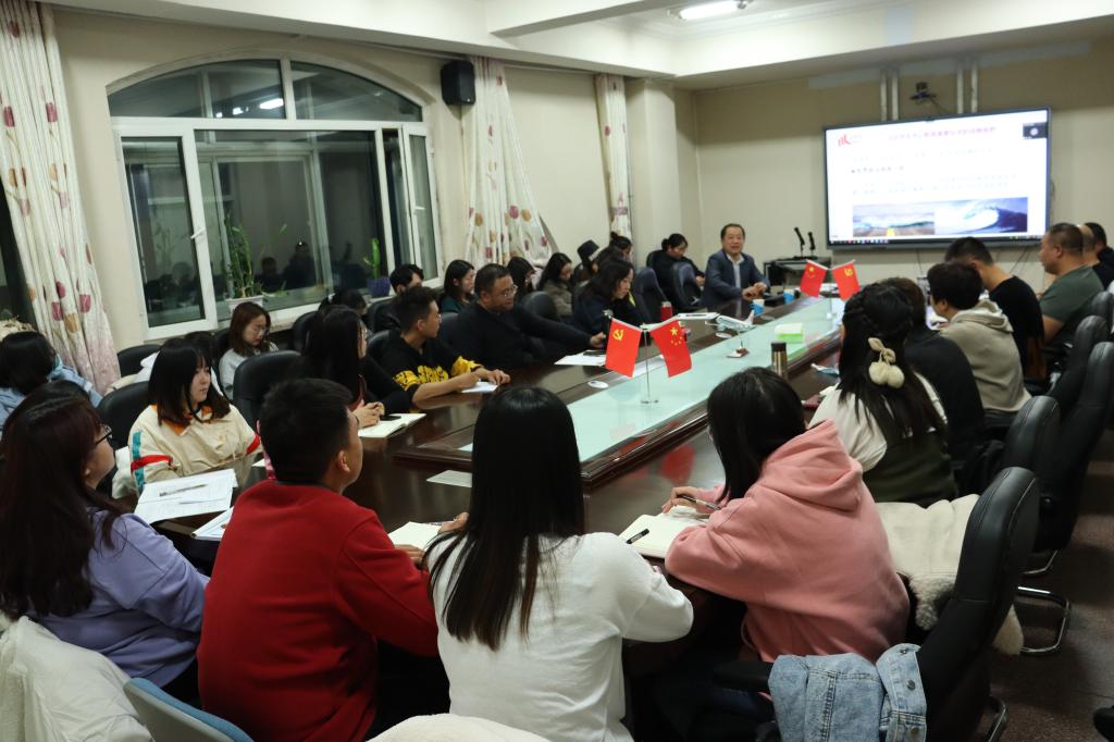 10月23日晚,公司在电力大楼331会议室召开党总支理论中心组(扩大)学习会暨2020年发展对象培训班第四讲。特邀马克思主义公司布和朝鲁教授对《深入学习理解习近平总书记教育重要论述》进行讲授,公司党总支书记马利强主持,公司全体教职工、员工党员、入党发展对象和积极分子,分别在现场和腾讯会议共同进行聆听学习。