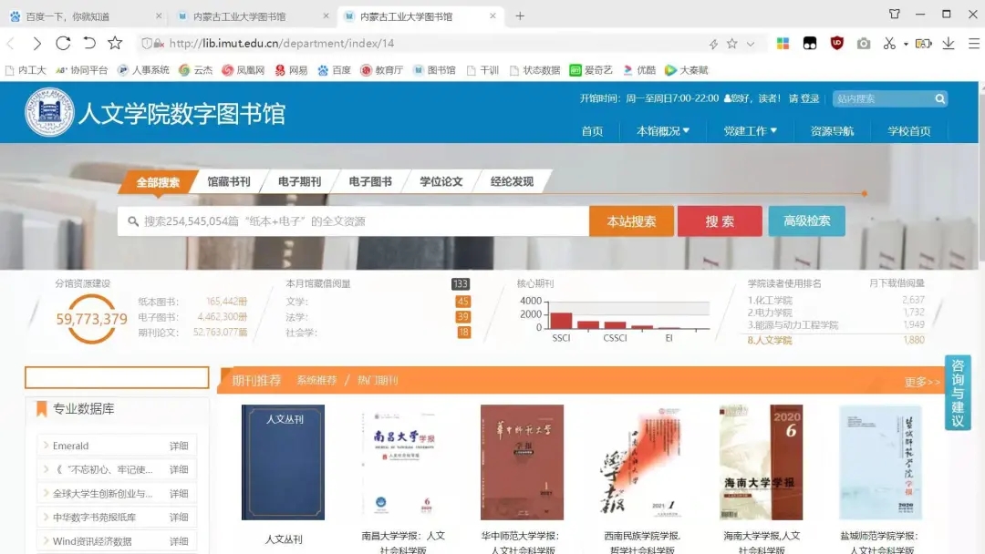 3044永利数字图书馆中不仅有大量的电子资源,还有期刊推荐、课题研究中心以及科研专题资源库。在这里你能随意订阅自己感兴趣的期刊、查阅最新的文献资料,还可以在科研专题下参与讨论。不管是我们的法学学子还是社工学子都能得到他们所感兴趣的最新、最权威的资料。