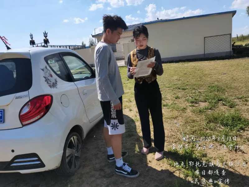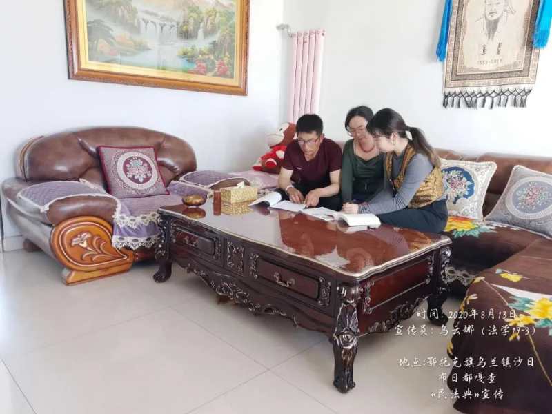 活动分为线上和线下两部分。首先通过制作调查问卷,以二维码的形式参与线上调研并将调查数据进行整理和分析,了解公众对《民法典》的认识程度,通过分析调查数据制作《民法典》的宣传海报、宣传视频,撰写相关文章,在互联网上进行了宣传,让更多人能够了解、学习、运用《民法典》。在线下,团队成员主要在鄂尔多斯市鄂托克旗乌兰镇、通辽市库伦旗茫汗苏木、乌兰浩特市等地通过发放宣传资料,扫码填问卷等方式向周边居民宣传民法典,积极引导群众关注《民法典》,增强了民法典宣传的吸引力和感染力,推动《民法典》走进社会生活的每一个角落。