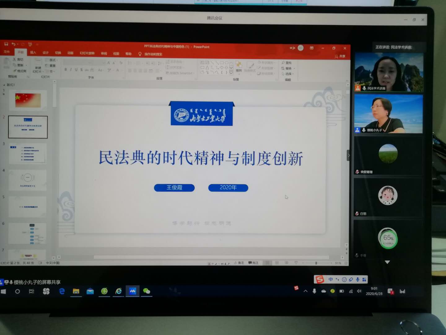 628日上午,在腾讯会议493 947 4336房间举办“人文讲坛”2020第一讲“民法典的时代精神与制度创新”,公司王俊霞教授主讲,苏丽娜副经理主持。