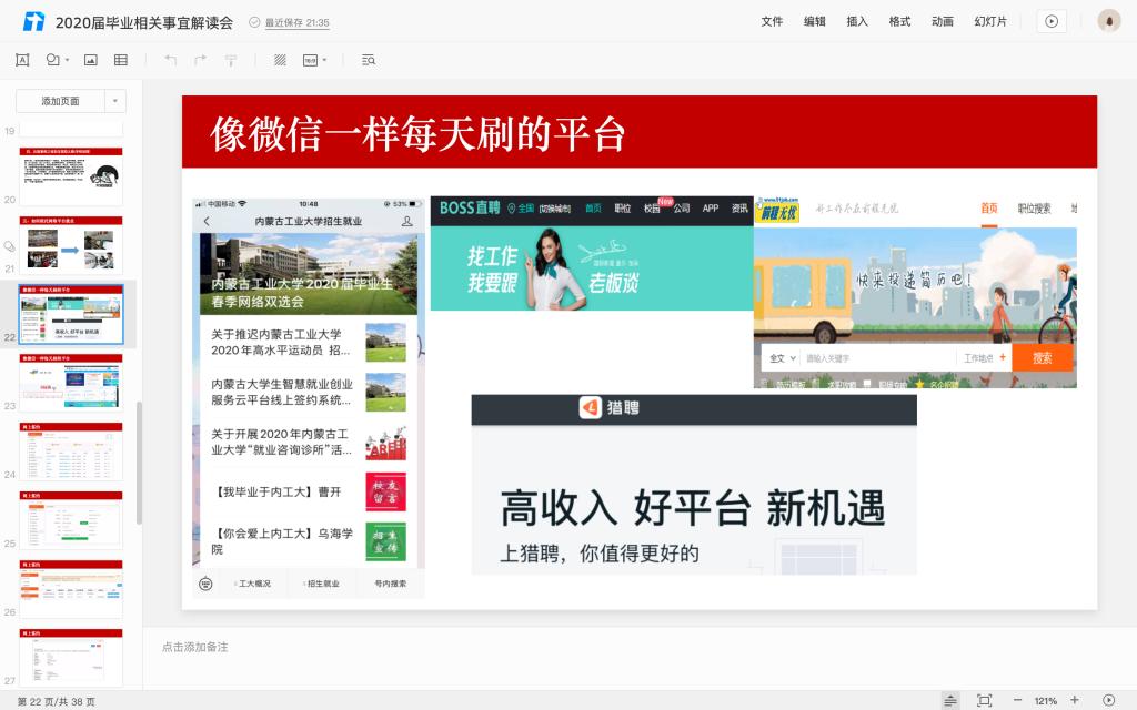 会上,首先分析就业形势。2020年全国普通高校毕业生874万,内蒙古2020年需要就业的应往届毕业生17.1万,比去年增加近9000人,就业压力增大。其次,解读国家相关政策。今年国家会通过基层项目扩招、研究生招生规模扩大、以及加大网络招聘力度来缓解高校毕业生就业压力。再次,指导网络求职。受疫情影响,现场招聘会均改为网络招聘。会上给同学们推荐智联招聘前程无忧“Boss直聘等正规求职网站,动员员工每天关注校园招聘专区。同时示范网上签约流程,对网络简历的设计进行指导。最后,梳理毕业流程,进行就业安全教育。