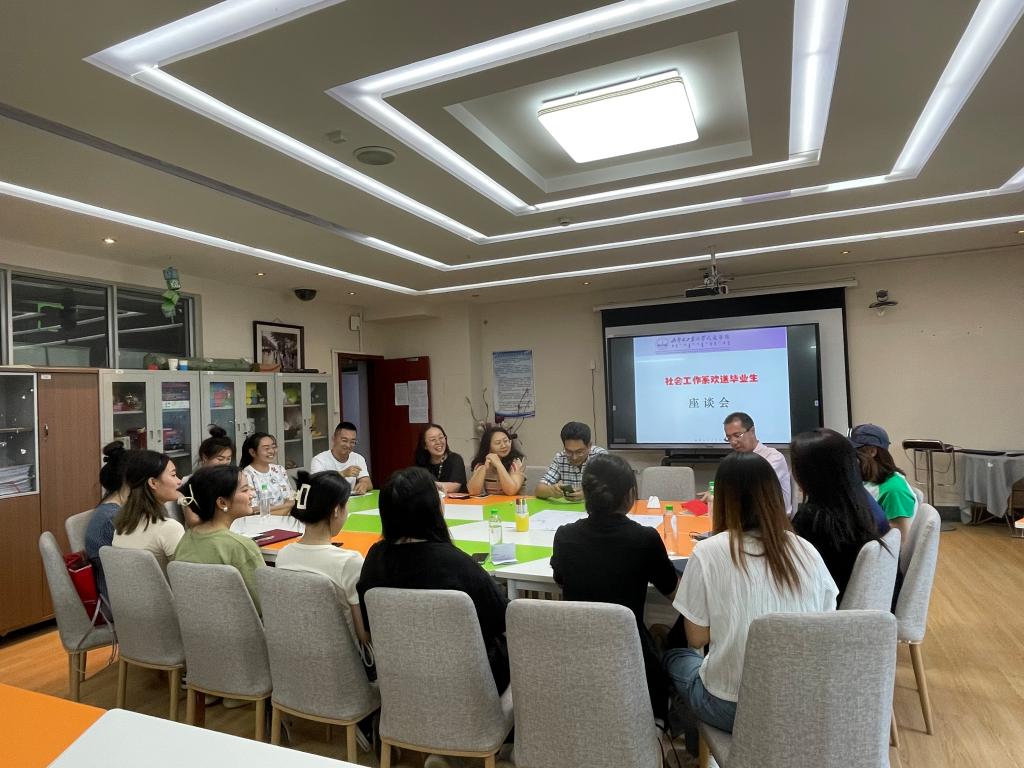 6月27日,社会工作系组织返校毕业生在社会工作实验室召开了欢送毕业生座谈会,部分返校本科生、MSW毕业生和毕业生班主任方香廷、李鑫、特日格乐老师以及系教师代表廉婷婷老师参加,系支部书记、副主任利爱娟主持。