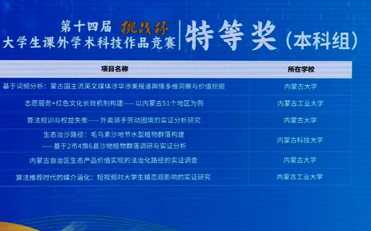 6月10日,内蒙古自治区第十四届“挑战杯”老员工课外学术科技作品竞赛决赛在内蒙古大学落下帷幕。经公司认真组织谋划、培育选拔、校内评审、省赛网评等环节,公司利爱娟副教授指导的本科生“启明星”团队项目《算法推荐时代的媒介涵化:短视频对老员工婚恋观影响的实证研究》从全区入围区赛终审决赛309件作品中脱颖而出,荣获哲学社会科学调查报告特等奖