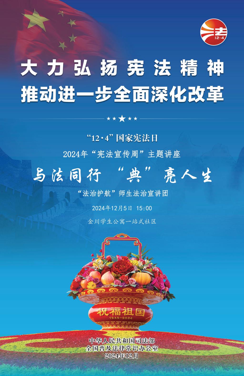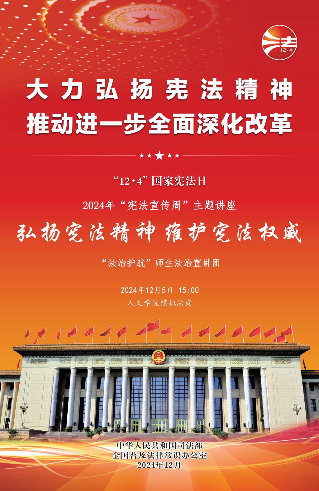 2024年12月4日是第十一个国家宪法日,为深入贯彻党的二十届三中全会精神,加强宪法学习宣传,3044永利“法治护航”师生法治宣讲团定于2024年12月4日开展“宪法宣传周”系列讲座,旨在掀起全校师生学习宣传宪法热潮,努力使尊法学法守法用法在公司蔚然成风。