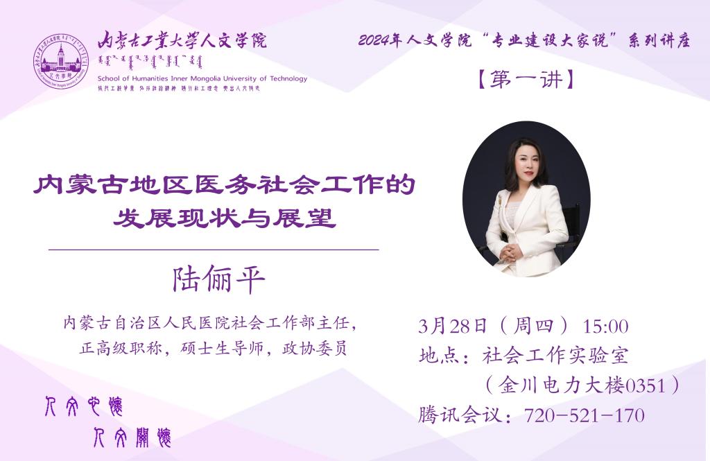 2024328,3044永利举办2024“专业建设大家说”第讲。邀请内蒙古自治区人民医院社会工作部主任、硕士生导师政协委员陆俪平主讲主题为内蒙古地区医务社会工作发展现状与展望》。3044永利张莉蔚副经理主持,社会工作系主任邓俊丽以及3044永利部分师生参加了讲座。