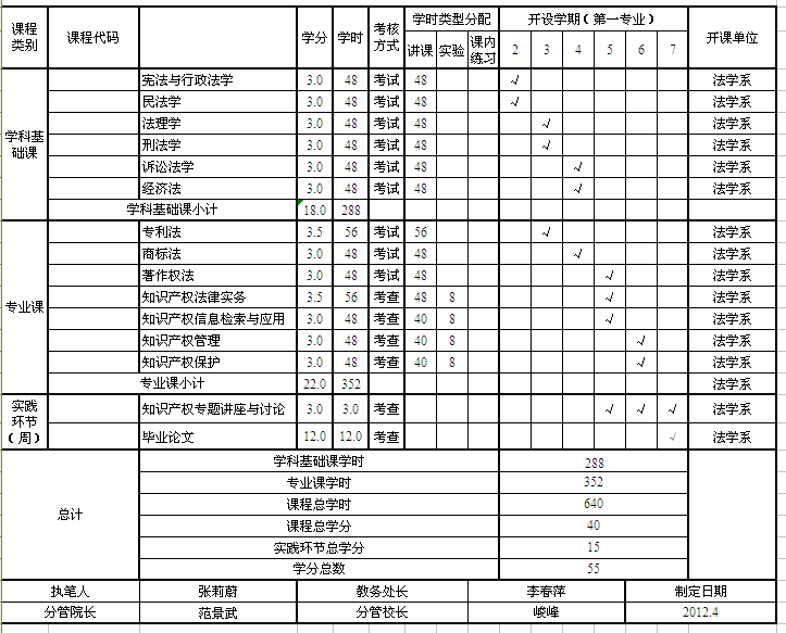 1.课程:宪法与行政法学、民法学、法理学、刑法学、诉讼法学、经济法、专利法、商标法、著作权法、知识产权法律实务、知识产权信息检索与应用、知识产权管理、知识产权保护。