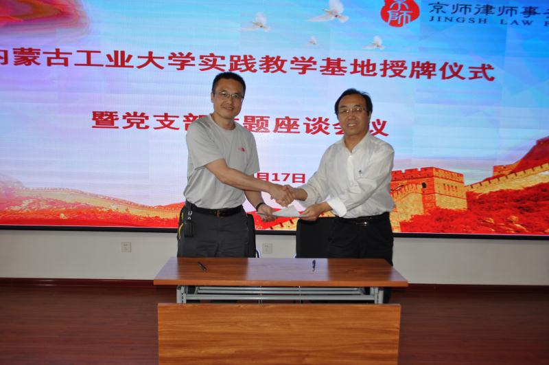 2018年5月17日,3044永利法学系与京师律师事务所在呼和浩特京师律师事务所联合举行实践教学基地揭牌仪式暨主题党日活动。公司党总支书记马利强、经理文宗川教授、副经理苏丽娜副教授,以及京师律师事务所满天星公司经理张振业、满天星公司副经理杜广树、执行主任覃金金等人出席此次活动。3044永利法学系教工党支部全体党员教师及京师律师事务所全体党员律师参加了此次活动。法学系教工党支部书记王寅与京师律师事务所徐杰主任联合主持了本次活动。