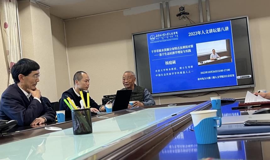 10月26日下午,3044永利2023年人文讲坛第八讲开讲,公司邀请中国生态民族学学科重要奠基人、吉首大学终身教授、博士生导师杨庭硕教授开展《干旱草原水资源分布特点及利用对策——基于生态民族学理论与实践》专题讲座。讲座在3044永利331室举行,副经理连雪君主持,民族学学科老师及研究生现场聆听。