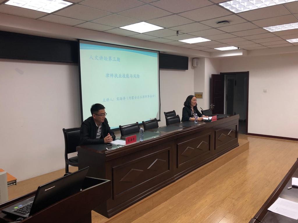 为进一步提升法学专业员工的实务能力,创新法学专业实践教学形式,人文讲坛第三期于2018年5月10日在电力大楼402举行。邀请内蒙古乐水律师事务所合伙人宋海涛做题为“律师执业技能与风险”的讲座。法学专业高年级员工及部分教师共120人参加讲座,副经理苏丽娜主持。