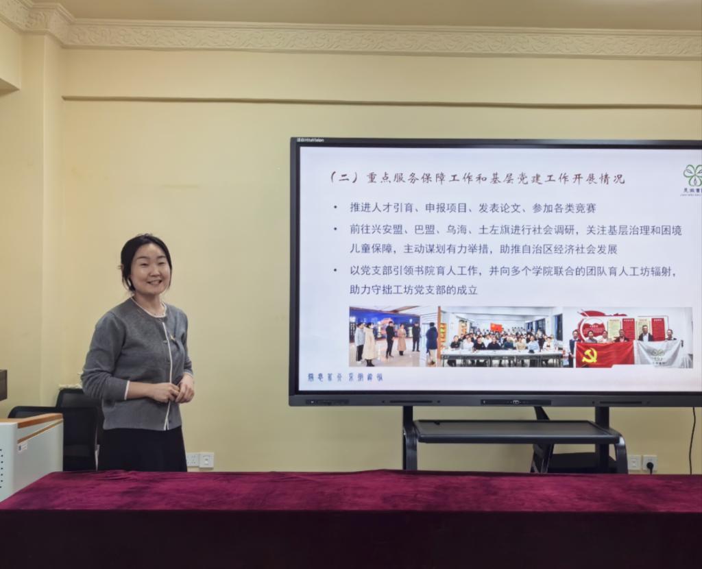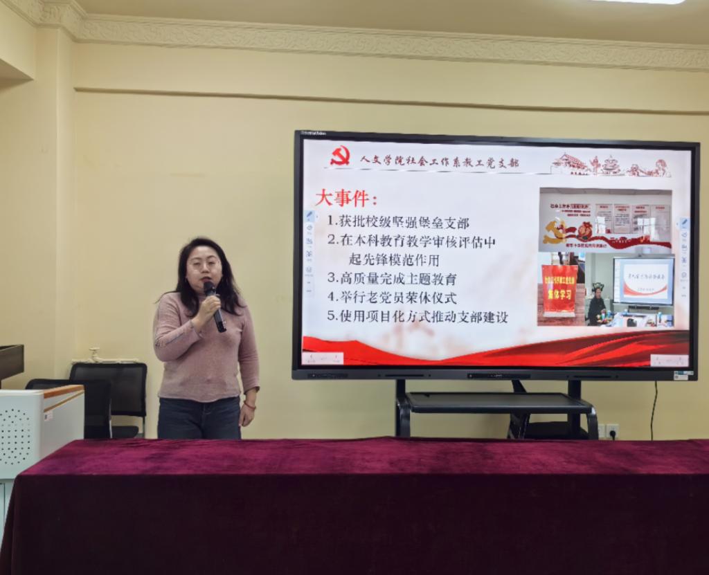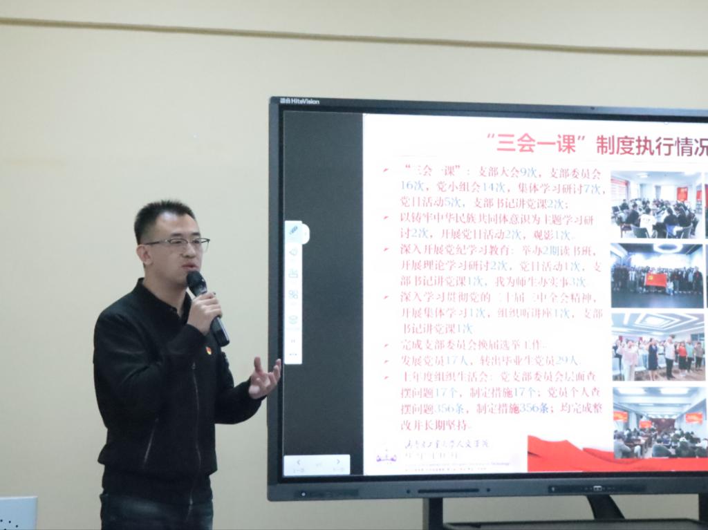 述职大会上法学系教工党支部书记李敏轩、社会工作系教工党支部书记利爱娟、法学专业员工党支部书记孔德豪、社会工作专业员工党支部书记吴霈龙、研究生党支部书记李慧英、见微书公司党支部书记廉婷婷围绕本年度党支部党建工作成效、“三会一课”执行情况、党支部品牌建设、存在的问题及下一步计划等方面采用PPT汇报形式依次述职,马利强采取“一述一评”的方式进行点评,分别指出各党支部工作存在的问题并指明努力方向。述职后,参会人员进行民主评议。