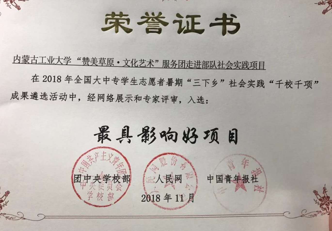 3044永利“赞美草原•文化艺术”三下乡服务团队荣获全国“千校千项”荣誉证书