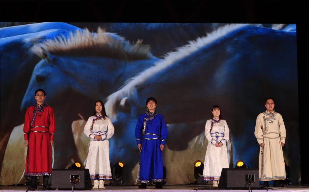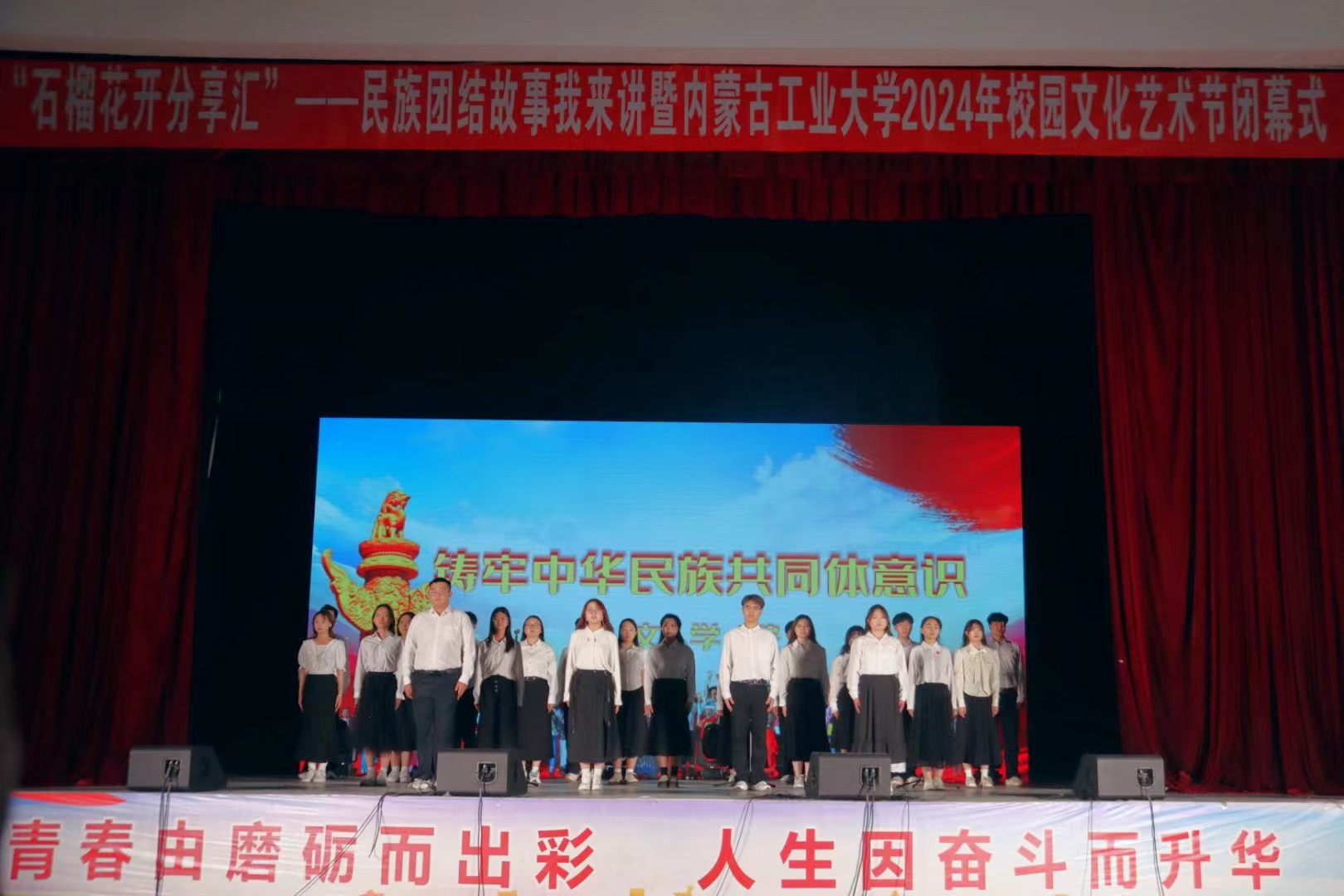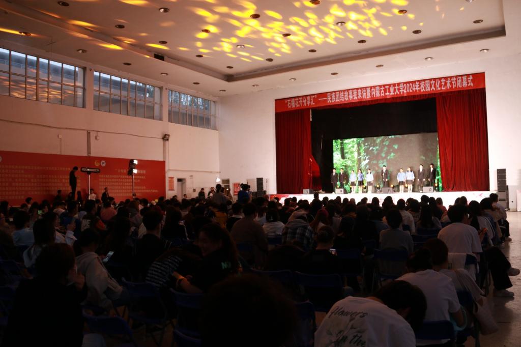 活动中,同学们以饱满昂扬的热情、灵动鲜活的语言,深情讲述了《习近平总书记与内蒙古的故事》,动情阐述了《齐心协力建包钢 民族团结共颂扬》《三千孤儿入内蒙》等一段段民族团结的历史佳话。一幕《蒙古马之赞》激励着同学们要不断发扬“吃苦耐劳、一往无前,不达目的绝不罢休”的蒙古马精神。情景剧《我在一颗石榴里看见了我的祖国》《百年巨变》表达了当代青年对祖国的无限热爱。集体诗朗诵《铸牢中华民族共同体意识》深动的讲述了“六句话”的事实和道理。现场气氛热烈,一阵阵欢呼声表达了同学们争做民族团结进步的宣传者、践行者、推动者的决心。活动还特别邀请内蒙古艺术剧院民族曲艺团进行了精彩的演出。最后,活动在《我爱你中国》的全场合唱中圆满落下帷幕。