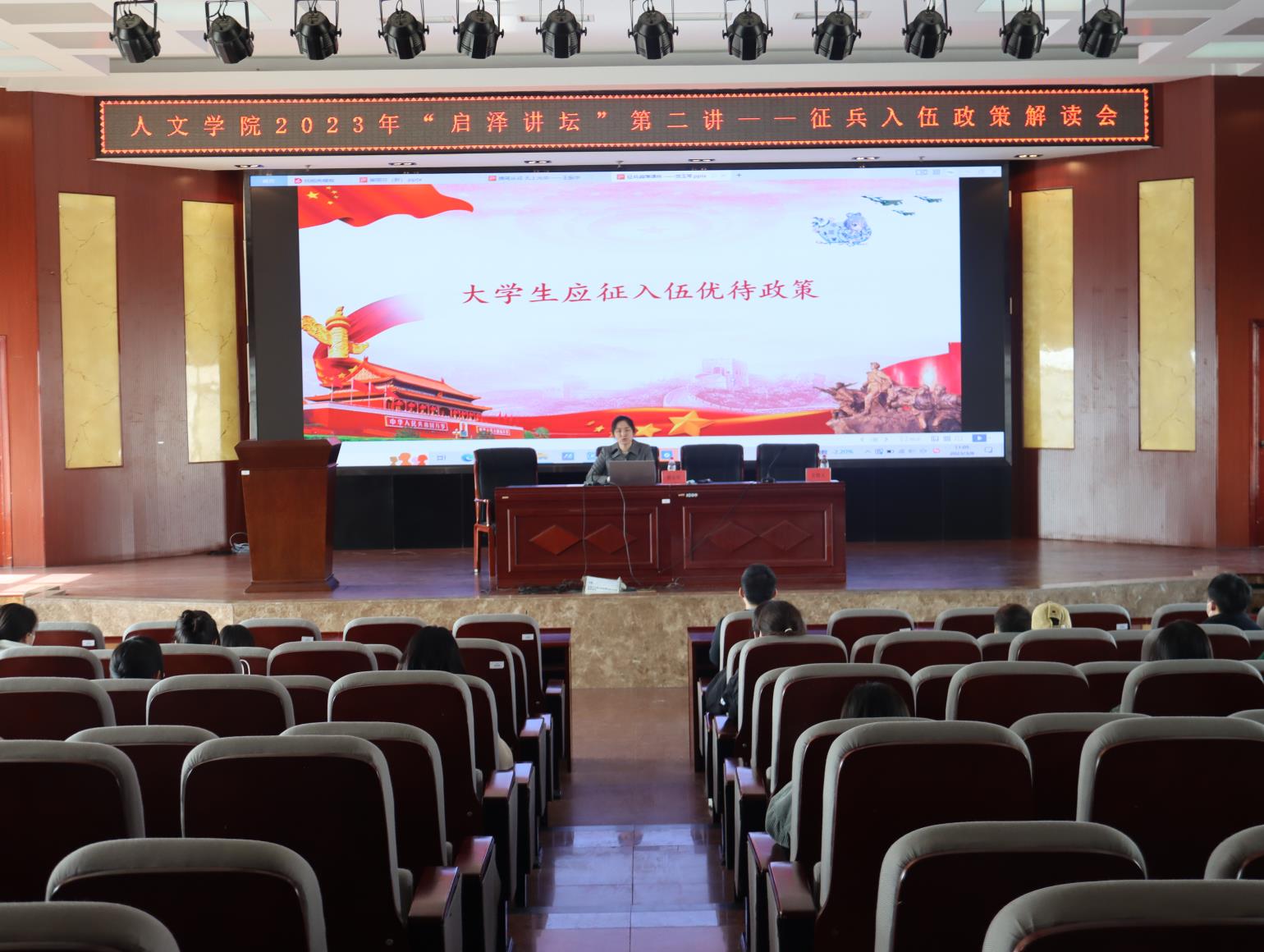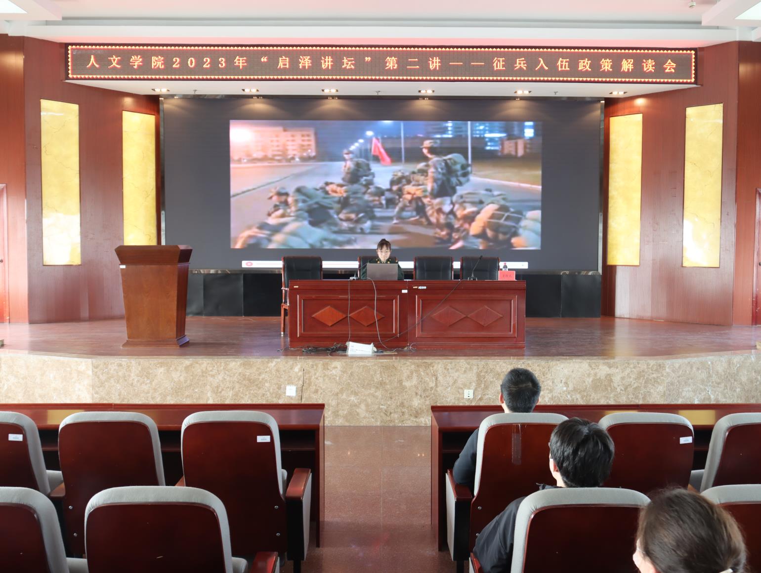 38日上午公司在电力大楼十楼第一报告厅举办2023年“启泽讲坛”第二讲——征兵入伍政策解读宣讲会。邀请公司党委员工工作部军事教研室主任、副研究员贺玉琴老师作专题报告团学办公室副主任陈槟颖老师主持,部分员工代表参加。