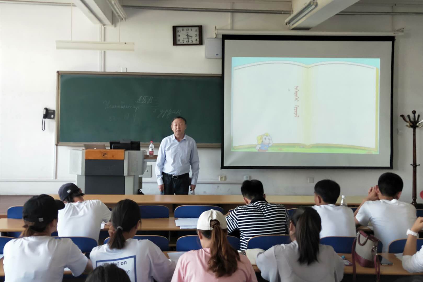 讲座伊始,斯钦教授讲述了他个人学习新蒙文的经历,让同学们先对新蒙文有一个初步的认识。紧接着,斯钦教授向同学们讲授了新蒙文字母的发音及其规律并讲述了如何运用俄文来翻译新蒙文,希望同学们在课余时间对照32个字母表进行发音练习,努力学好新蒙文。