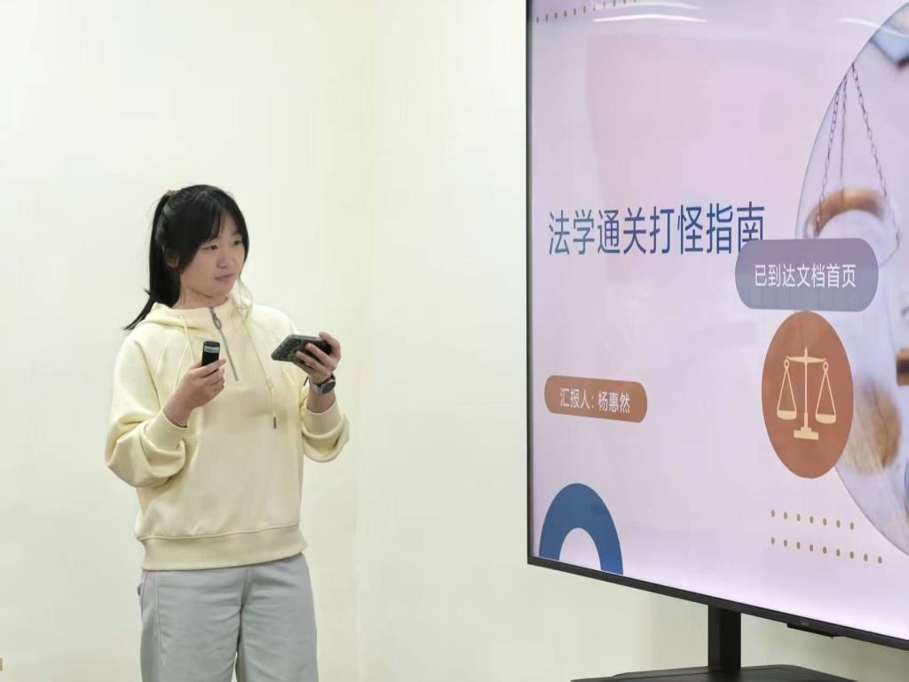 分享会上,乌兰夫奖学金获得者屈玥竹以《停止幻想,开始奋斗》为题,结合自身经历,强调专注与坚持的重要性。她鼓励新生树立清晰目标,培养独立思考能力。多次获得国家励志奖学金、校级荣誉的杨惠然则聚焦学习方法与工具,以“法学是一场精彩旅程”为喻,详细介绍了艾宾浩斯记忆法、思维导图等实用技巧。她幽默而真诚的讲述,为新生提供了切实可行的学习指导。最后设置了自由交流环节,就专业学习、职业规划等问题进行了深入互动。